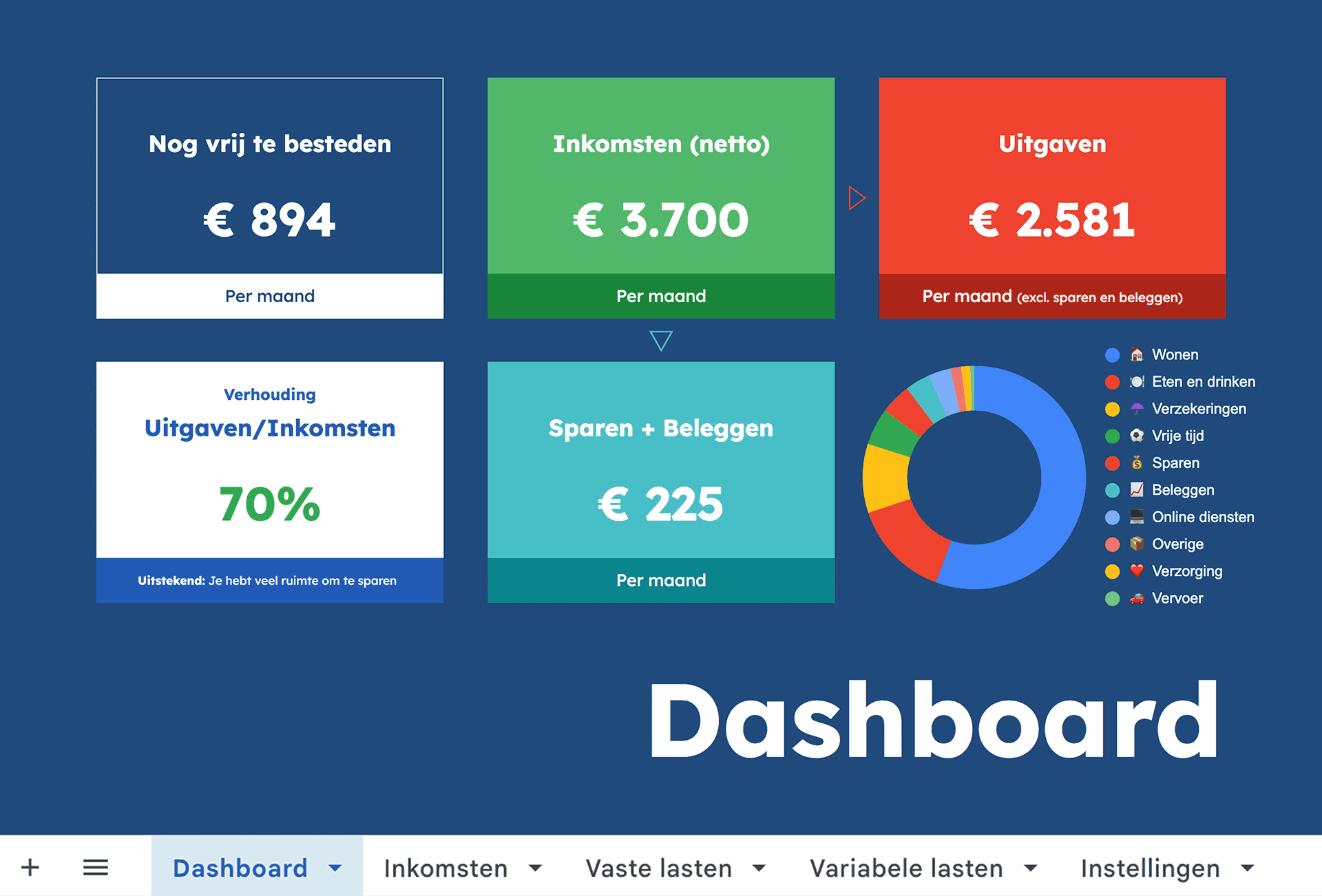 Vul je inkomsten en uitgaven in. Het dashboard, de grafieken en signalen werken direct automatisch.